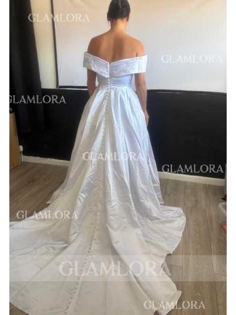 • A-line Pretty Off-the-Shoulder Sleeveless Chapel Train Satin Wedding Dress