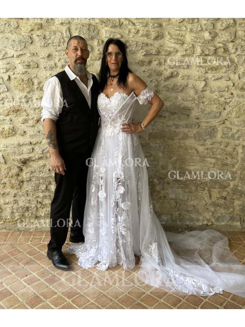 • A-line Princess Off-the-Shoulder Sleeveless Court Train Subtle Tulle Wedding Dress With Applique