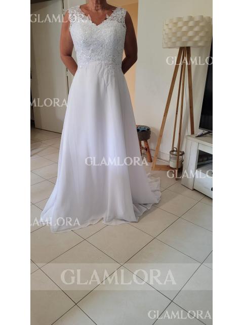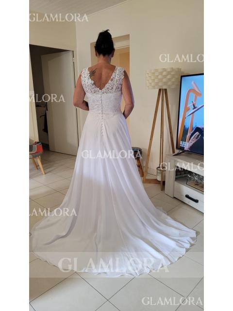 Radiate timeless elegance in this A-line wedding dress, boasting a flattering V-neckline and sleeveless design adorned with intricate lace appliques. Crafted from flowing chiffon, it cascades gracefully to the floor with a sweeping train, adding an extra touch of romance. Perfect for the bride seeking classic beauty and sophistication on her special day.