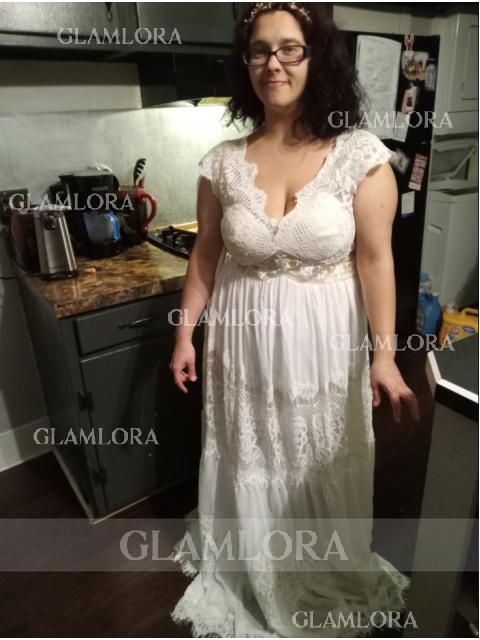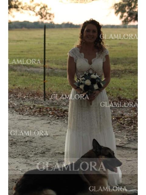 • A-line V-Neck Short Sleeves Elegant Floor-Length Lace Wedding Dress With Ruched