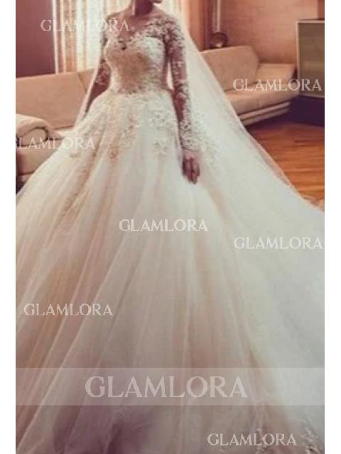 Ball-Gown Princess Off-the-Shoulder Long Sleeves Chapel Train Dreamy Tulle Wedding Dress
