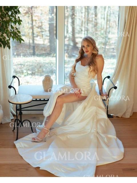 • Charming Sheath Sweetheart Pleated Chapel Train Satin Corset Convertible Wedding Dress