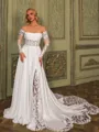 This elegant A-line wedding dress features a romantic off-the-shoulder neckline and long sleeves adorned with delicate lace appliques. Crafted from lightweight chiffon, it is designed with a structured corset bodice for a flattering fit and flows into a graceful chapel train, combining timeless sophistication with refined elegance for the special day.