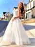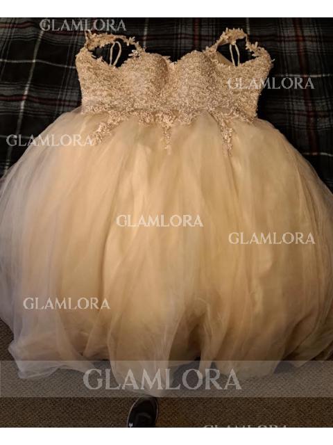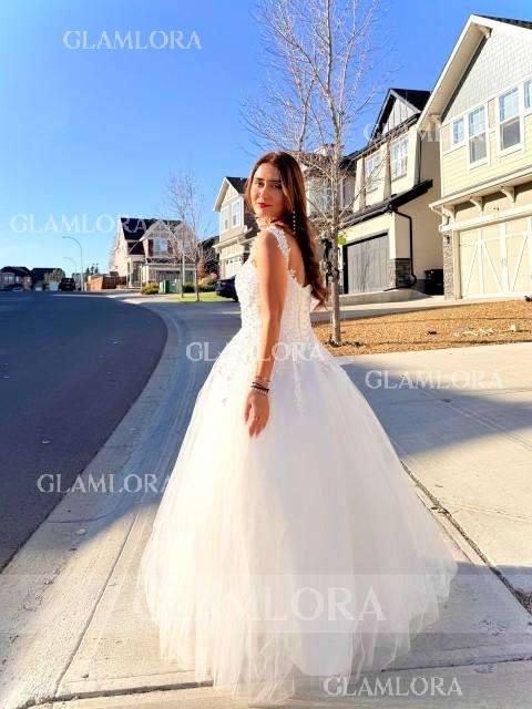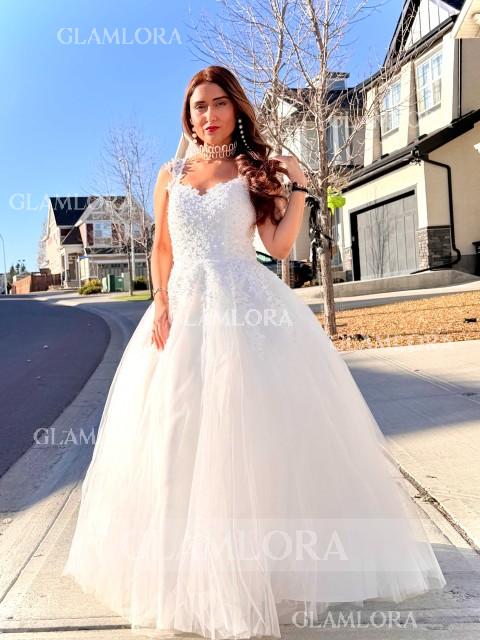 Indulge in fairy-tale charm with this ball gown wedding dress, featuring a sweetheart neckline and sleeveless design embellished with delicate lace appliques. Crafted from ethereal tulle, it flows elegantly to the floor, exuding romance and grace. Perfect for the bride who dreams of a classic and enchanting look on her special day.