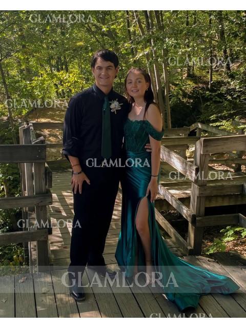 This stunning sheath dress features an elegant off-the-shoulder design and a sleeveless silhouette, crafted from silk like satin for a comfortable yet structured fit. Intricate lace appliques adorn the bodice, adding a touch of romance and sophistication. With a graceful sweep train, this dress is perfect for formal occasions, exuding timeless beauty and style.