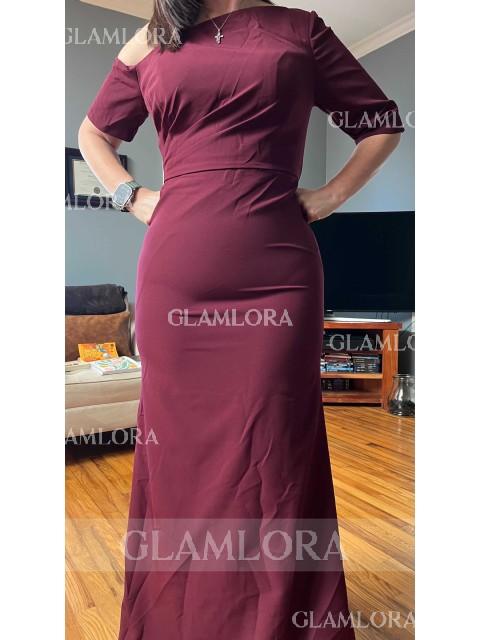 This elegant Mother of the Bride dress features a sheath silhouette with one shoulder and short sleeves. The floor-length design is crafted from stretch crepe fabric, adorned with delicate ruffles for a sophisticated and flattering look.