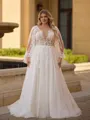 This plus size A-line wedding dress features a flattering V-neckline and elegant long sleeves, adorned with delicate lace appliques. The soft tulle skirt flows into a graceful court train, while the A-line silhouette flatters every figure, creating a romantic and timeless bridal look.