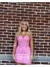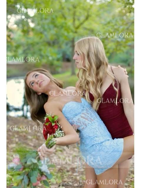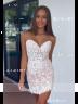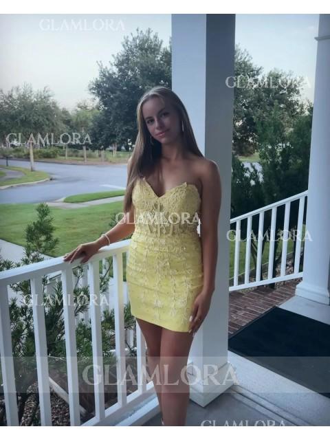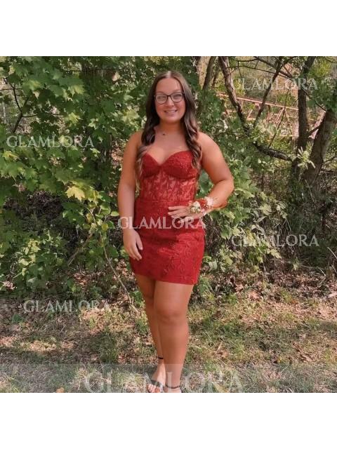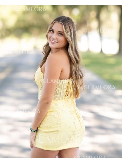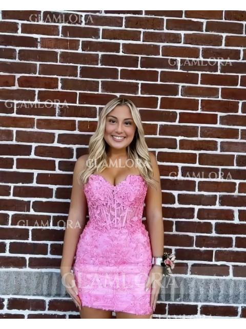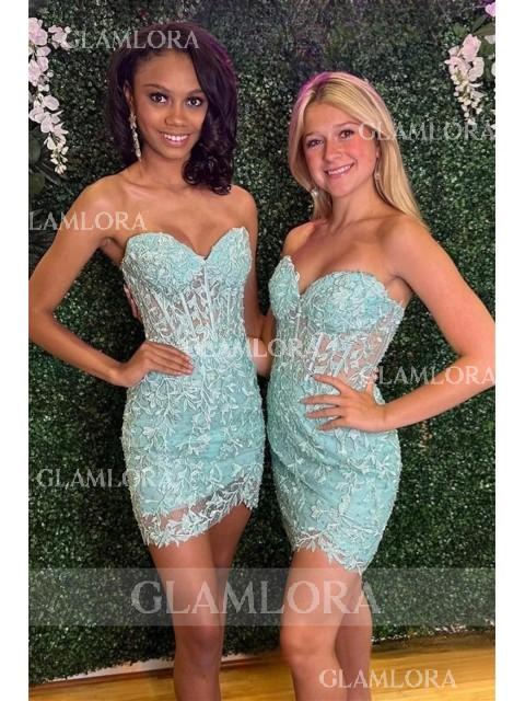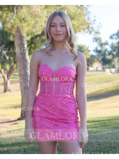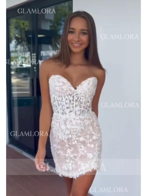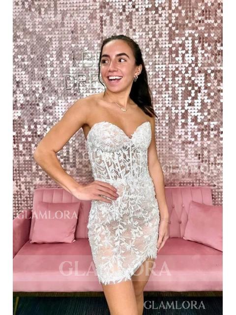This sheath dress with corset bodice, and lace appliques, offering a captivating short/mini look.