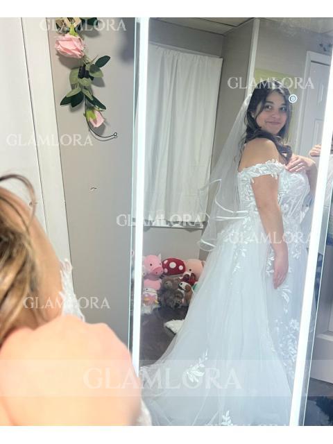 Graceful A-line wedding dress with an off-the-shoulder neckline, sleeveless design, and intricate lace appliques. The gown extends into a cathedral train crafted from delicate tulle, and a corset detail adds a touch of romance and sophistication, creating a timeless and elegant bridal ensemble.