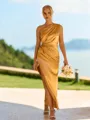 This chic bridesmaid dress features a sleek sheath silhouette with a stylish one shoulder neckline and sleeveless design. Made from smooth silk like satin, it drapes beautifully and offers a soft, elegant sheen. The pleated detailing adds a touch of sophistication, while the ankle length hem creates a modern and graceful look, perfect for weddings and formal events.