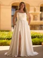 This plus size A-line wedding dress features delicate spaghetti straps with a sleeveless design and a fitted charmeuse corset bodice. The pleated skirt flows gracefully into a sweep train, creating a flattering and elegant bridal look.
