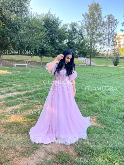 Glam A-line Sweetheart Short Sleeves Appliques Lace Court Train Tulle Corset Convertible Dress