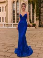 A glamorous sheath prom dress crafted from luxurious satin, featuring a timeless V-neckline and a sleeveless design for a sleek, modern look. The sweep-train hem adds a touch of drama and elegance, while the smooth satin fabric creates a refined, graceful silhouette perfect for making a stunning entrance.