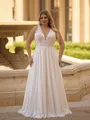 This plus size A-line wedding dress features a flattering V-neckline and sleeveless design, adorned with delicate lace appliques. The corset bodice accentuates the figure, while the flowing chiffon skirt reaches floor-length, creating an elegant and timeless bridal look.