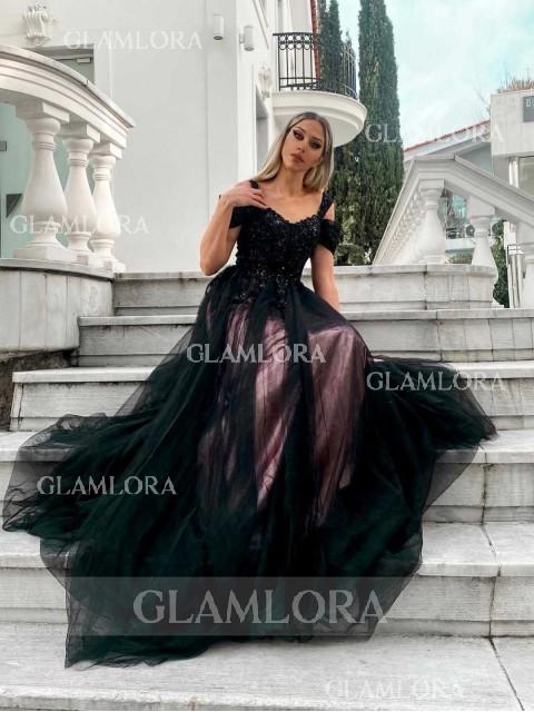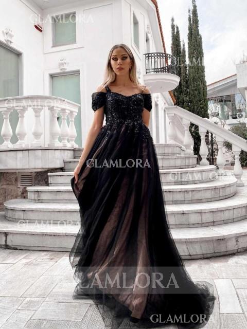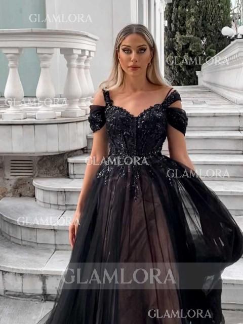 A romantic A-line tulle dress featuring a cold shoulder design and sleeveless bodice, adorned with intricate lace appliques for a delicate, feminine touch. The corset bodice provides a flattering, structured fit, while the sweep train adds an elegant and graceful finish. Perfect for weddings or formal events, this dress blends timeless charm with modern sophistication.Make the colors as shown, and the other colors one color at a time.