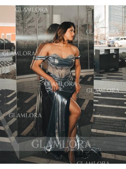 • Graceful Sheath Off-the-Shoulder Beading Sweep Train Metallic Satin Corset Dress