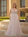 This plus size A-line wedding dress features a classic scoop neckline and sleeveless design, adorned with delicate lace appliques. The corset bodice flatters the figure, while the soft tulle skirt flows into an elegant court train, creating a romantic and timeless bridal look.