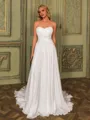 This elegant A-line wedding dress features a romantic sweetheart neckline and a sleeveless design. Crafted from flowing chiffon with delicate pleated detailing, it is designed with a structured corset bodice for a flattering fit. The graceful sweep train adds a romantic and sophisticated touch, creating a timeless bridal look perfect for the special day.