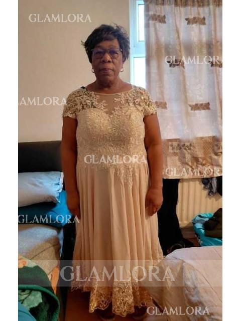• Immaculate A-Line Chiffon Applique Bateau Short Sleeves Tea-Length Mother of the Bride Dress
