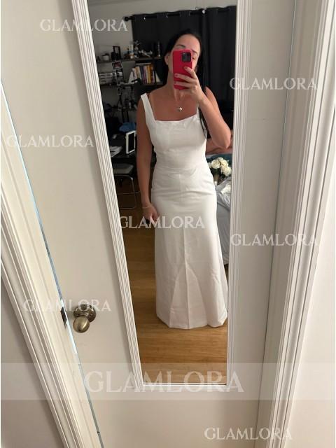 Sleeveless sheath wedding dress with a square neckline and floor-length hem in stretch crepe fabric.