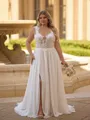 This plus size A-line wedding dress features delicate straps and a sleeveless design, adorned with intricate lace appliques. The lightweight chiffon skirt flows into a graceful sweep train, while the A-line silhouette flatters every figure, creating a romantic and elegant bridal look.