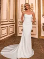 This elegant sheath wedding dress features a clean straight neckline and a timeless sleeveless design. Crafted from comfortable stretch crepe, it showcases subtle pleated detailing and a structured corset bodice for a flattering fit. The graceful court train adds a refined and sophisticated touch, creating a timeless bridal look perfect for the special day.