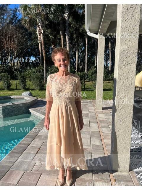Sophisticated Scoop A-line Short Sleeves Lace Appliques Chiffon Tea-Length Mother of the Bride Dress CA$182.24