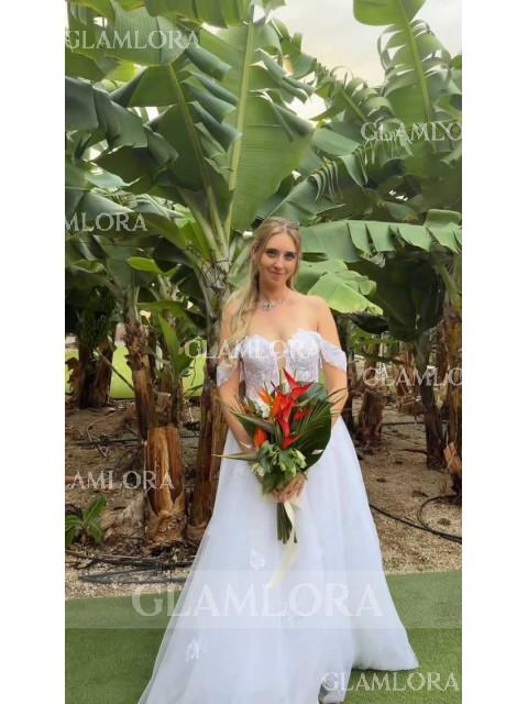 Embrace timeless romance in this A-line wedding dress, featuring an off-the-shoulder neckline, sleeveless design, and delicate lace appliques. Crafted from airy tulle, it showcases a graceful chapel train and a flattering corset bodice. Perfect for a bride seeking classic elegance with a touch of modern sophistication.