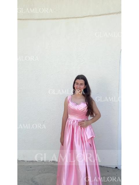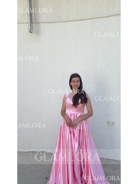 A stunning A-line dress with an off-the-shoulder, sleeveless design, crafted from silk like satin for a comfortable yet elegant fit. The ruffles add texture and movement, while the sweep train enhances the dress's graceful flow. Perfect for formal events or special occasions.