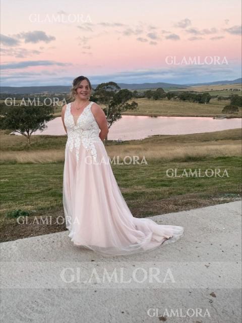 • Perfect A-line V-Neck Court Train Tulle Wedding Dress With Applique