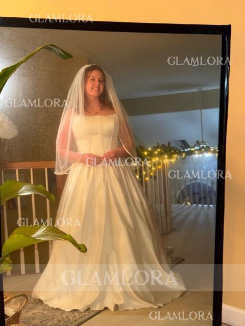 This majestic ball gown wedding dress features a straight neckline and a sleeveless design, exuding classic elegance. Crafted from rich satin, the voluminous skirt flows into a dramatic cathedral train, making a breathtaking statement. The structured corset bodice offers a flattering, secure fit while enhancing the waistline for a regal silhouette. Perfect for grand ceremonies, this timeless gown combines sophistication and splendor for an unforgettable bridal look.
