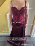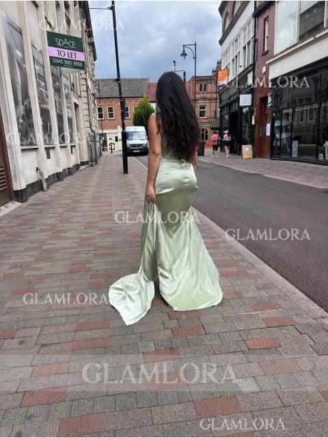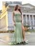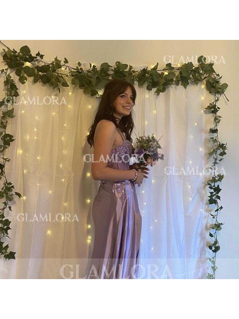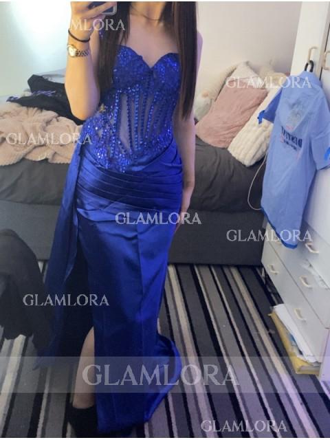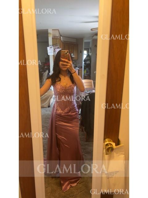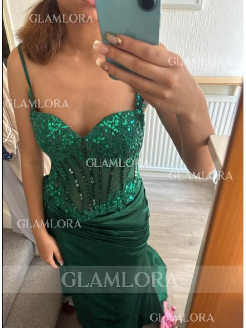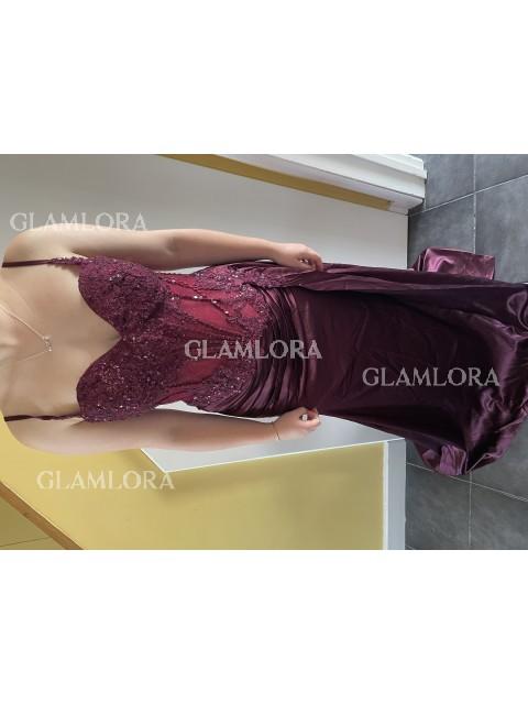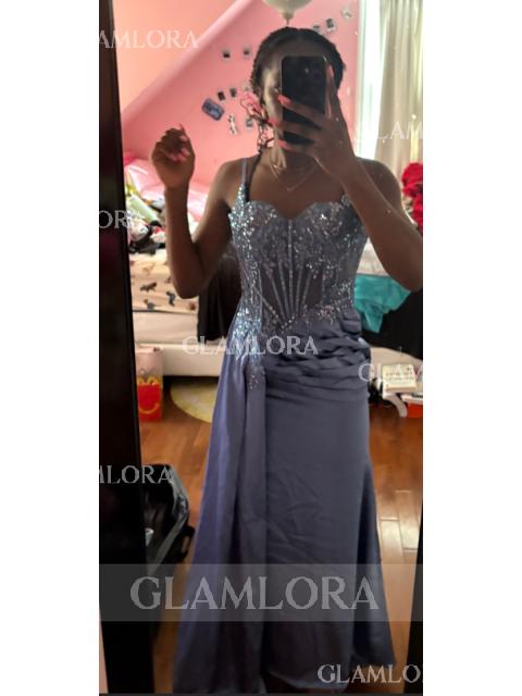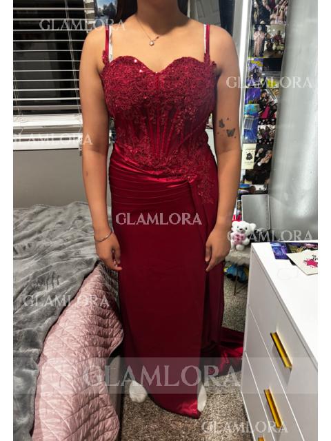 A sheath dress with spaghetti straps and sleeveless design, adorned with intricate lace appliques. Made from silk like satin, it features a corset bodice for a structured fit and a sweep train for added elegance. Perfect for a luxurious and sophisticated look.