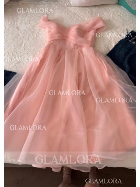 • Pretty A-line Off-the-Shoulder Pleated Tea-Length Organza Dress