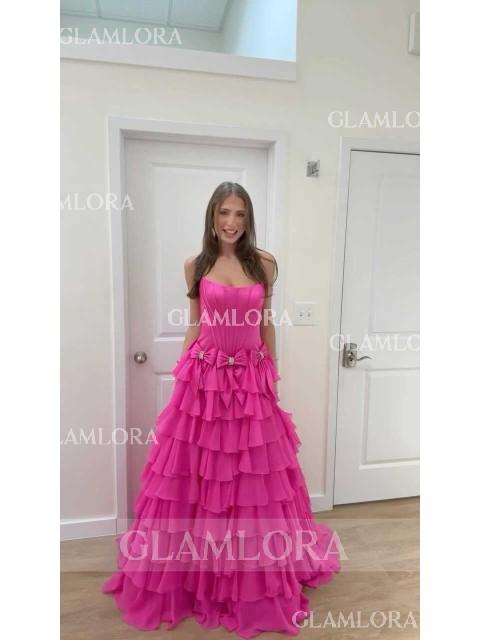 • Pretty A-Line Straight Bow Sweep Train 30D Chiffon Corset Prom Dress