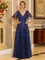 • Regal A-line V-Neck Short Sleeves Sequin Floor-Length Tulle Corset Mother of the Bride Dress