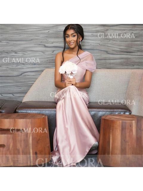 • Sheath/Column Classic One-Shoulder Satin Floor-Length Bridesmaid Dress With Pleated