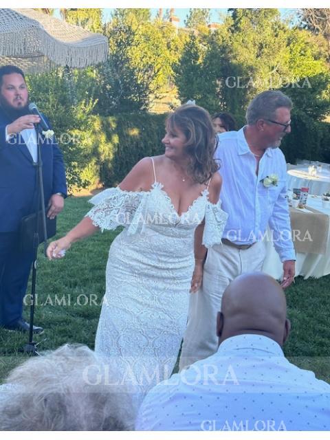 • Sheath/Column Exquisite V-Neck Short Sleeves Sweep Train Lace Wedding Dress With Applique