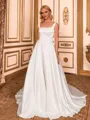 This elegant A-line wedding dress features a classic square neckline and a timeless sleeveless design. Crafted from smooth satin, it includes a structured corset bodice for a flattering fit and flows into a graceful chapel train, creating a refined and sophisticated bridal silhouette.