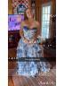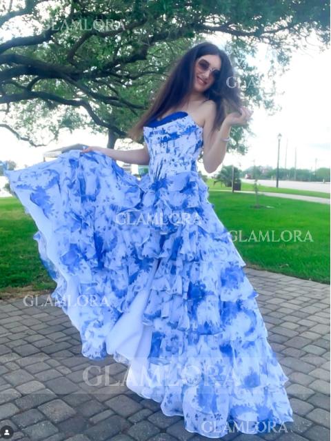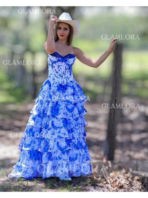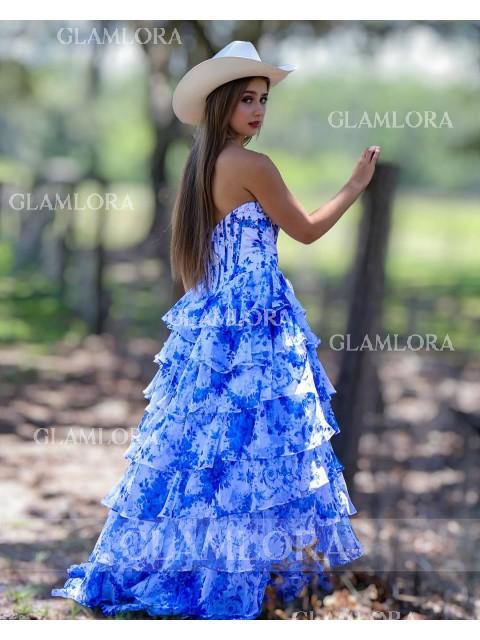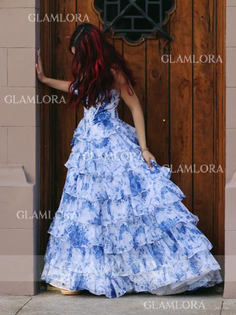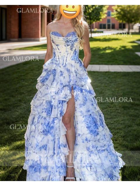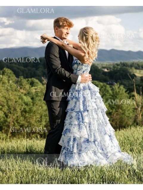This breathtaking A-line dress features a flattering sweetheart neckline and a sleeveless design, creating a soft, feminine look. The cascading ruffles along the skirt add texture and volume, creating a stunning, dramatic effect as the dress flows. The corset-style bodice cinches the waist, enhancing the figure and providing a defined silhouette. The sweep train adds a touch of elegance and movement, making it perfect for formal occasions or weddings. Combining modern elegance with romantic details, this dress exudes timeless beauty and sophistication.