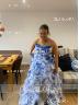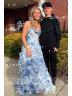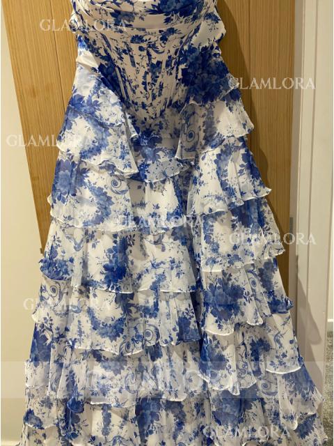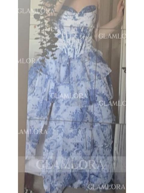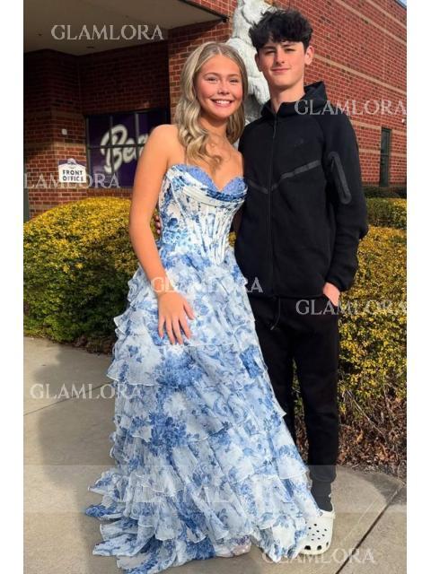 The A-line Sweetheart Sleeveless Cascading Ruffles Sweep Train Corset Dress features a flattering sweetheart neckline and a sleeveless design. Cascading ruffles add texture and dimension to the skirt, while the corset bodice offers a fitted and structured look. The sweep train enhances the gown