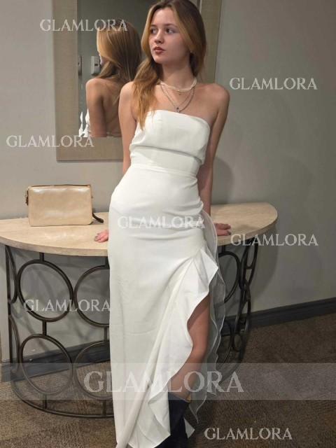 A sleek sheath dress with a straight neckline,elegant ruffle details,and a floor-length silhouette,made from stretchy crepe fabric for comfort and style.
