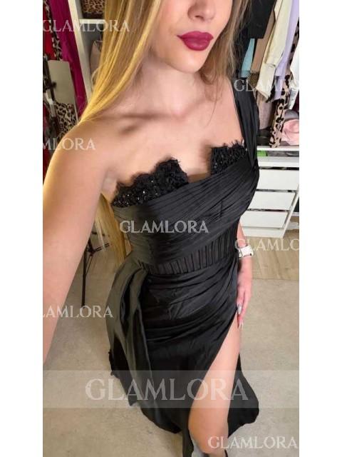 1.Exuding sophistication and grace, this sleeveless corset dress features an A-line silhouette with a chic one-shoulder neckline. Adorned with delicate applique.