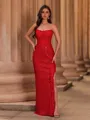 A form-fitting sleeveless sheath dress with a straight silhouette, adorned with lace appliques. It falls to a floor-length and includes a corset for a structured fit.