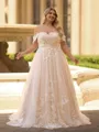 This plus size A-line wedding dress features an off-the-shoulder neckline with a sleeveless design, adorned with delicate lace appliques. The corset bodice enhances the figure, while the flowing tulle skirt extends into a graceful sweep train, creating a romantic and flattering bridal look.