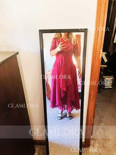 • Stunning A-Line Chiffon Applique Scoop 3/4 Sleeves Asymmetrical Mother of the Bride Dress