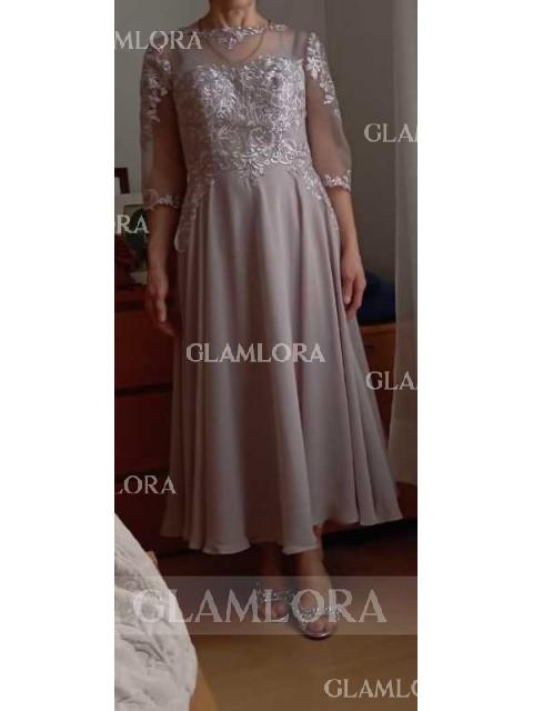 • Stunning A-Line Chiffon Lace Scoop 3/4 Sleeves Tea-Length Mother of the Bride Dress