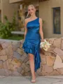 A chic sheath bridesmaid dress featuring a one-shoulder, sleeveless design with cascading ruffle details. The fitted corset waist flatters the figure, while the tea-length hem creates an elegant and playful silhouette perfect for weddings and special occasions.