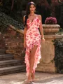 This sheath V-neck sleeveless dress features cascading ruffle details and an asymmetrical hem for a playful and stylish look. The fitted silhouette creates a flattering and elegant appearance, perfect for parties, homecoming, or special occasions.