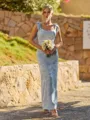 A stylish sheath bridesmaid dress featuring a square neckline and sleeveless design, accented with a charming bow. Falling to an ankle-length hem, it creates a sleek and elegant silhouette perfect for weddings and special occasions.