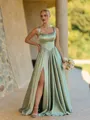 An elegant A-line bridesmaid dress featuring thin straps and a sleeveless design. The fitted corset waist flatters the figure, while the silk-like satin fabric flows to a floor-length hem, creating a sophisticated and timeless silhouette perfect for weddings and formal occasions.